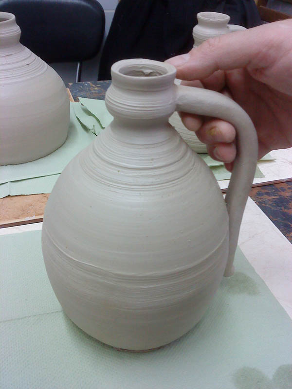Po powrocie z Cejkovic natychmiast odtworzyłem na kole butle, które tam widzieliśmy (na razie nie są szkliwione albo pokryte angobą) - które wg mnie doskonale nadają się do pitnego chwarszczańskiego miodu (otrzymałem taki we wrześniu od Piotra Żurawicza choć w "nieadekwatnych" plastikowych butelkach) Do wina proponuję inne butle - na fotografii najwyższa jaką udało mi się zrobić - około 40 cm. A na Ciebie Adrianie czeka jak już pisałem - "Komtur Ekko - Modry Portugal" z Cejkovic.