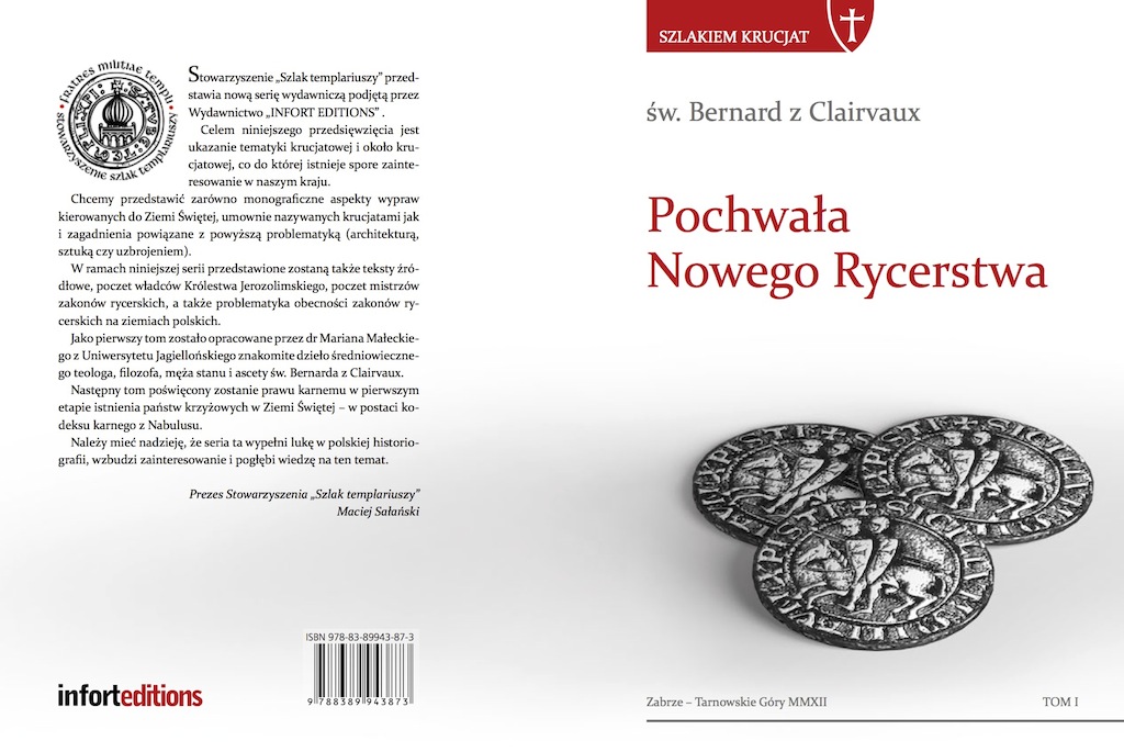 Stowarzyszenie Szlak templariuszy przedstawia nową serię wydawniczą podjętą przez Wydawnictwo „INFORT EDITIONS” . Celem niniejszego przedsięwzięcia jest ukazanie tematyki krucjatowej i około krucjatowej, co do której istnieje spore zainteresowanie w naszym kraju. Chcemy przedstawić zarówno monograficzne aspekty wypraw kierowanych do Ziemi Świętej, umownie nazywanych krucjatami jak i zagadnienia powiązane z powyższą problematyką (architekturą, sztuką czy uzbrojeniem). W ramach niniejszej serii przedstawione zostaną także teksty źródłowe, poczet władców Królestwa Jerozolimskiego, poczet mistrzów zakonów rycerskich, a także problematyka obecności zakonów rycerskich na ziemiach polskich. Jako pierwszy tom zostało opracowane przez dr Mariana Małeckiego z Uniwersytetu Jagiellońskiego znakomite dzieło średniowiecznego teologa, filozofa, męża stanu i ascety św. Bernarda z Clairvaux. Następny tom poświęcony zostanie prawu karnemu w pierwszym etapie istnienia państw krzyżowych w Ziemi Świętej – w postaci kodeksu karnego z Nabulusu. Należy mieć nadzieję, że seria ta wypełni lukę w polskiej historiografii, wzbudzi zainteresowanie i pogłębi wiedzę na ten temat.